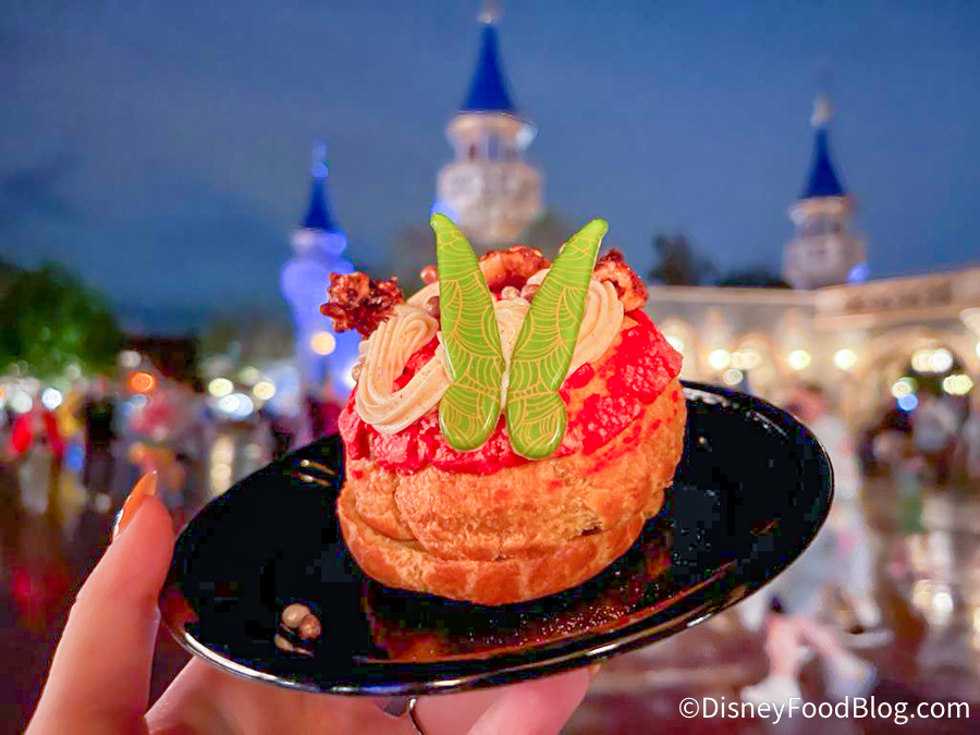 So this looks…interesting. This is the Tinker Bell Cream Puff from the Friar's Nook! It's cream puff and compressed carrot cake topped with spiced cream cheese icing, spiced walnuts, and chocolate wings. It's ONLY available during #MVMCP! pic.twitter.com/5r0tFnLmT2