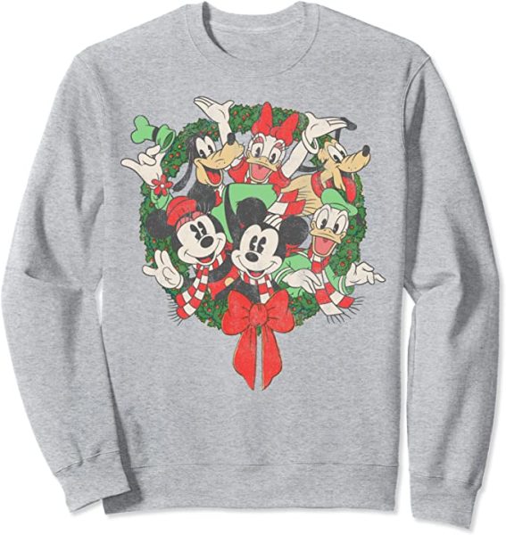 The Disney Group Shot Christmas Wreath Sweatshirt looks just like we caught the crew posing for their Christmas card photo. Surrounded by a wreath, each character is decked out in holiday wear. You can get your own from Amazon for $44.99.