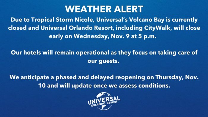 Universal Orlando Resort announced that due to Tropical Storm Nicole, Universal’s Volcano Bay water park has been already been closed, and the Universal Orlando Resort as well as CityWalk will be closing early as of 5PM on November 9th.