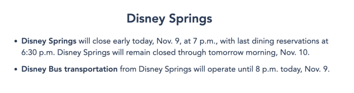 Disney Springs will remain closed through tomorrow morning, Thursday, November 10th. Also note that bus transportation from Springs will operate until 8PM today.