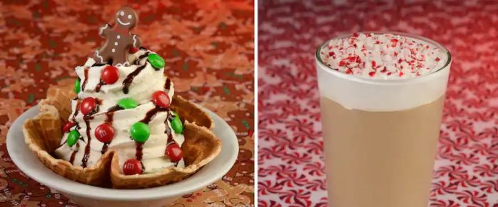 - Holiday Shake: Cookie butter milkshake with caramel drizzle and holiday sprinkles, topped with a Christmas tree cupcake (*New) (a version of this snack was available in 2021 but Disney has marked this item as “new” so it is possible that some ingredients have been changed)