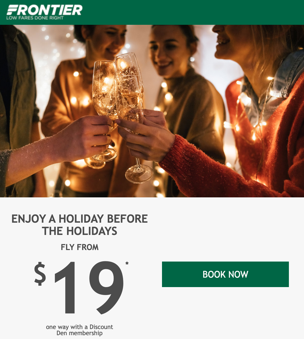 Frontier Airlines has released a new 19 Days for $19 deal, where for 19 days throughout November and December you can fly for as low as $19 one way with a Discount Den membership.