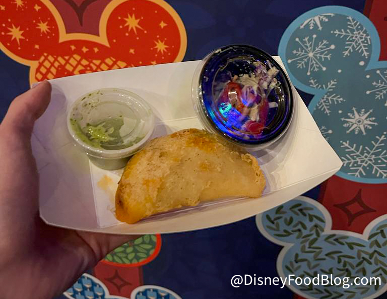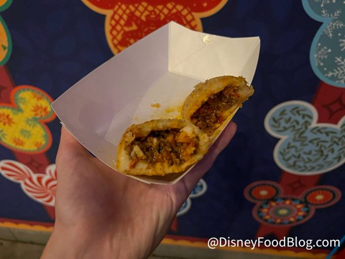 We’re happy to say this was delicious! The outside was warm and crunchy when you bit into it, and the inside was very flavorful. The beef had a sweet-ish taste we enjoyed, and the fresh pico inside was a great surprise. We loved the Aji Verde to dip this in, too.