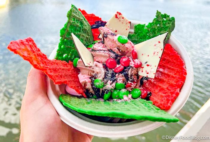 Next, there are Peppermint Chocolate Bark Soft-serve Nachos for $8.99. These are chocolate and peppermint soft-serve ice cream, waffle cone “nacho” pieces, peppermint bark pieces, chocolate sauce, M&Ms, and peppermint shavings.