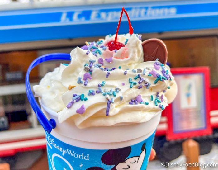 We stopped by I.C. Expeditions, home of the famous Sand Pail, for the Ice Dream Sand Pail Sundae, made with vanilla and birthday cake soft-serve ice cream, EARidescent sprinkles, waffle cone pieces, rainbow cake, hot fudge, caramel sauce, whipped cream, and a cherry, all layered in a 50th Anniversary Sand Pail Bucket for $16.99.