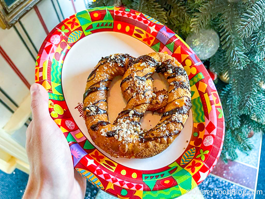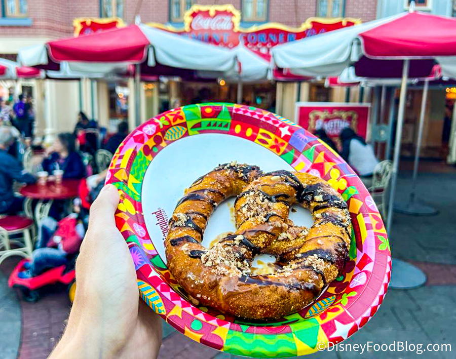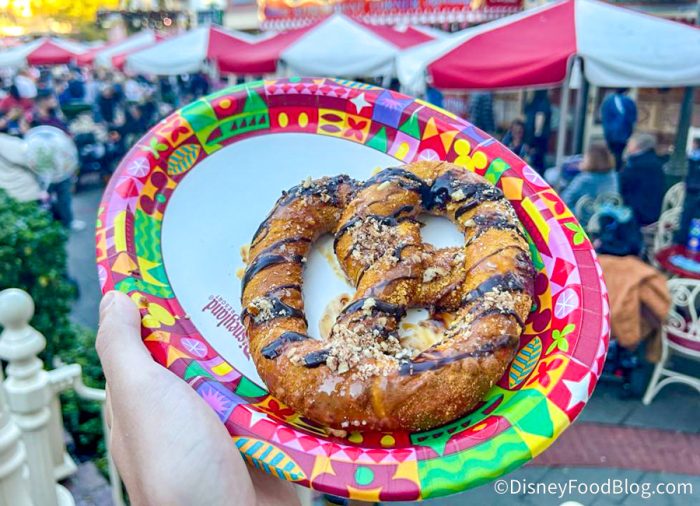 Over in Disney World, you can check out Mickey’s Very Merry Christmas Party or those awesome gingerbread displays. And, in Disneyland, you can attend Festival of Holidays, see the snow on the castle, and so much more. A great thing about the holidays in Disneyland is all of the new FOOD that arrives, so come along with us to check out a NEW pretzel in Disneyland park!