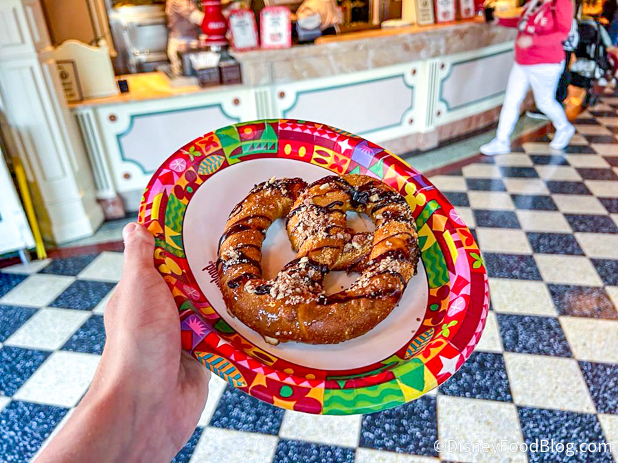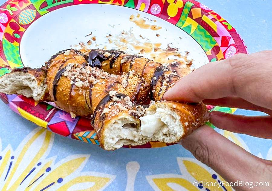This is the NEW Caramel-Pecan Cream Cheese Pretzel from Refreshment Corner. It’s a cream cheese pretzel topped with caramel sauce and candied pecans. Sounds pretty decadent, right?