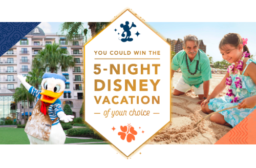 The winner of this sweepstakes can choose 1 of 2 vacation options, both of which involve a 5-day Disney vacation. One of the options is a trip to Disney World, including a stay at Disney’s Riviera Resort and 6 Park Hopper tickets, and the other option is a stay at Disney’s Aulani Resort in Hawai’i plus a $1,000 Disney gift card. Airfare is also included in the prize.