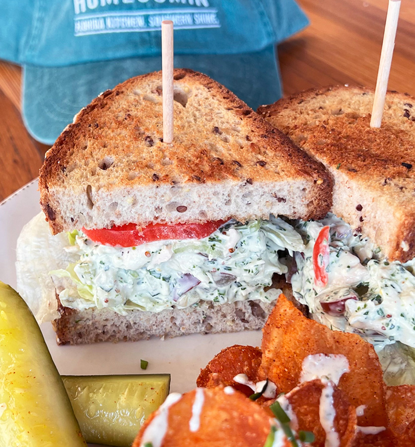 Next, there’s the Britton’s Chicken Salad Sandwich, which is Britton Smith’s recipe with pulled chicken, celery, grapes, Duke’s Mayo, and savory spices. It’s served with lettuce and tomato on artisan bread for $19.