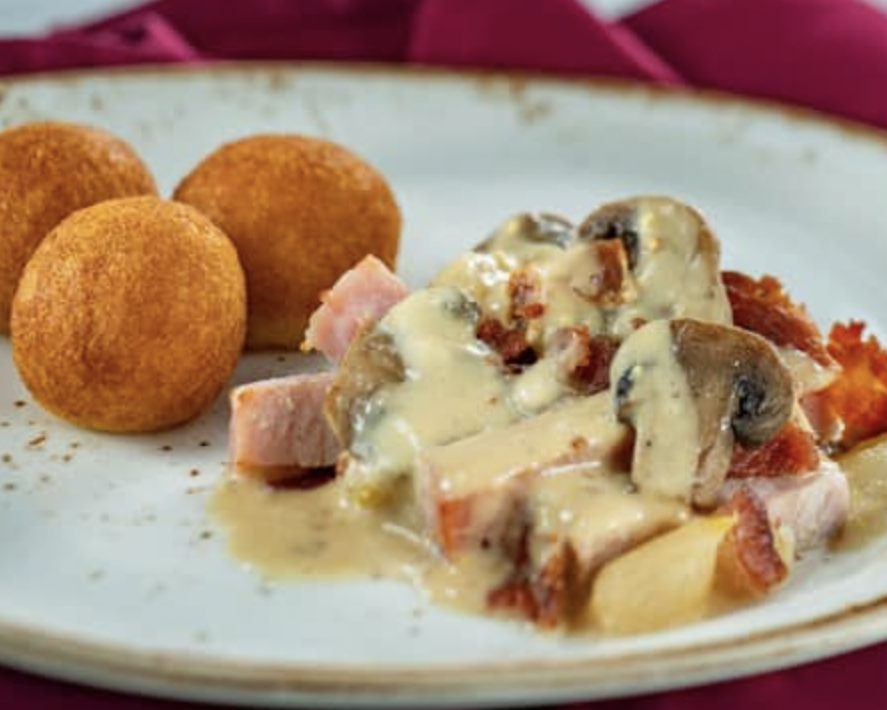 …Rôti de Jambon Sauce Moutarde à l’ancienne, Pommes Dauphine which is roasted ham with mushrooms, pearl onions, bacon, mustard sauce, and puff potatoes from Le Marche de Noel Holiday Kitchen…