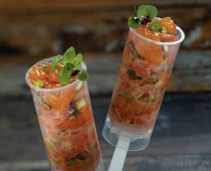 …Salmone alla Siciliana, which is cured salmon tartare, Sicilian blood orange, pistachios, and basil from Tuscany Holiday Kitchen…