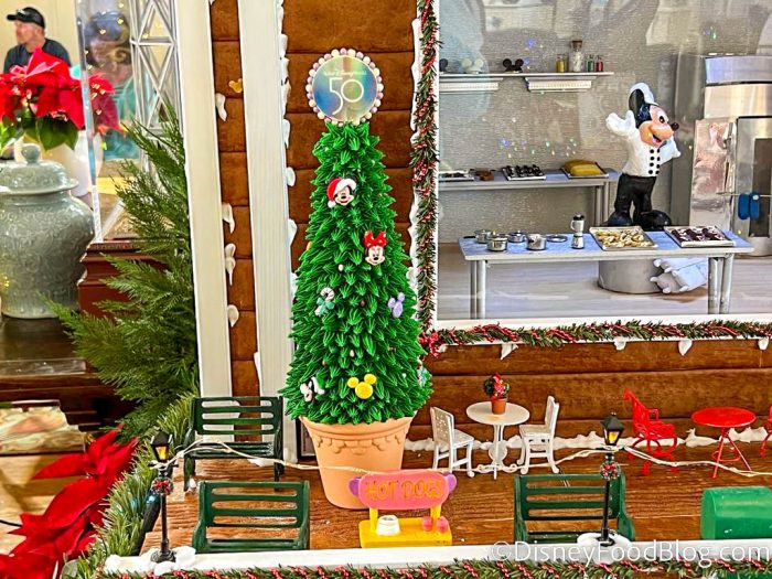 The front of the gingerbread model has tiny trees, wreaths, tables, and chairs. The trees have their own miniature ornaments!