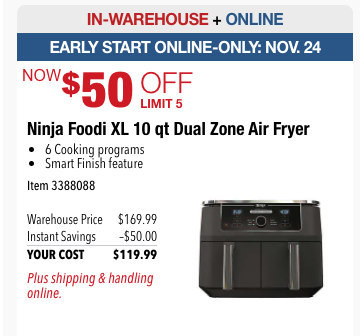 If you’re willing to wait a bit for more deals, mark your calendars for November 24th. That’s when you’ll get an early start online on an air fryer deal. With this discount, you’ll be able to score the Ninja Foodi XL 10 qt dual-zone air fryer for $50 off, bringing the price down to $119.99.