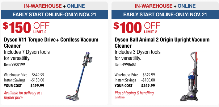 Both the Dyson V11 Torque Drive + Cordless Vacuum Cleaner AND Dyson Ball Animal 2 Upright Vacuum will be on sale soon at Costco.