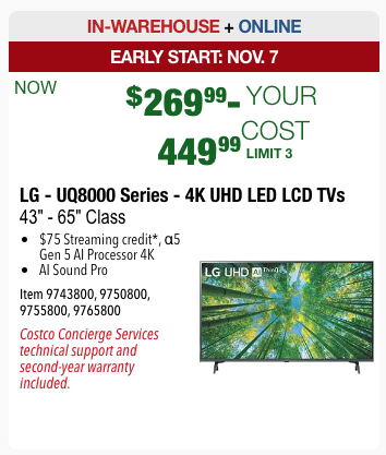 And finally, we’ve GOT to talk about those Costco TV deals! There are a number to pick from. On the lower end in terms of cost, you could get a Samsung 50″ TV (4K UHD LEG LCD) for $329.99. That price will only last through November 28th though, so you’ll want to act quickly.