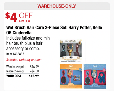 Now through November 28th, you’ll want to check your local Costco warehouse for some discounts on Wet Brush Hair Care sets. There is a Harry Potter design, a Belle design, and a Cinderella design (though the selection will vary by your location).