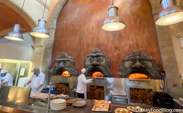 The soaring ceilings, rustic frescoes, and massive wood ovens — named Vesuvio, Etna, and Stromboli after three active volcanoes in Italy — found in the restaurant offer a casual and flavorful dining experience for EPCOT guests. Seriously, the pizza here is fantastic — it’s our favorite in Disney World — and offers a great value, to boot.