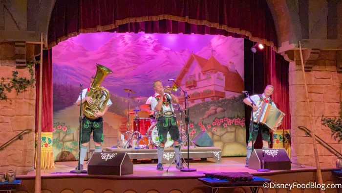 If you’re ready for an exciting, fun-filled meal, head over to Biergarten in EPCOT’s Germany for a spell! The Biergarten is a theater-style restaurant filled with long, family-style tables. It’s basically set up like an authentic German beer garden! The story (because every Disney experience has a story) is that this quaint Bavarian village is celebrating Oktoberfest and you get to experience it! No matter when you eat here, for lunch or dinner, every experience is set on this Oktoberfest evening. Up on stage, German performers showcase authentic Oktoberfest numbers throughout the day — lederhosen and all!