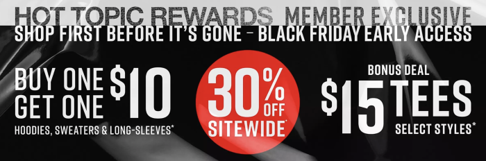 Right now, Hot Topic only has Black Friday deals open for Hot Topic Rewards Members…but it’s FREE to join their rewards program! So go ahead and make an account so you can get a head start on these deals!