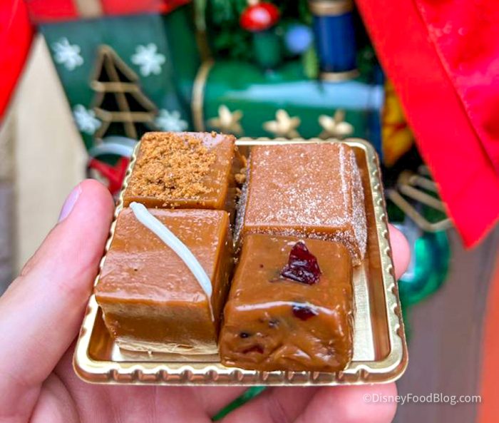 Staying in EPCOT for one more item, some seasonal treats have arrived at a popular snack spot — Karamell-Küche in the Germany pavilion. We specifically stopped by to try the Werther’s Original Holiday Caramel Flight, along with the Werther’s Original Caramel Snickerdoodle Cookie. See our review of the treats here!
