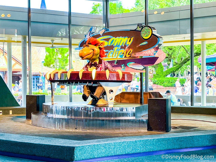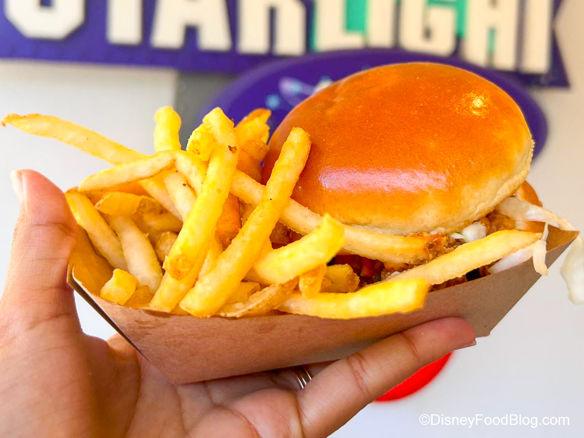 We’re headed over to say hi to Sonny Eclipse and grab the new Rocket Hot Chicken Sandwich from Cosmic Ray’s Starlight Cafe in Magic Kingdom! It’s a Spicy Fried Chicken sandwich topped with Pickle Slaw and Sonny Eclipse Rocket Aïoli on a Brioche Bun with your choice of a side. We went with fries — we love those Disney fries.