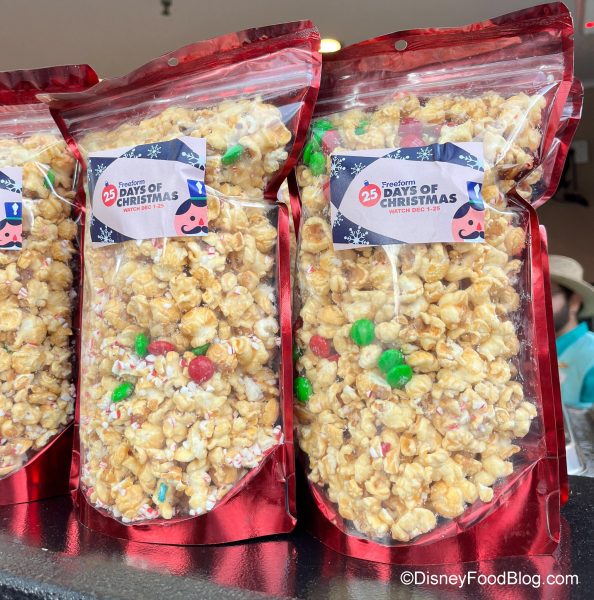 The Holiday Popcorn Mix is available here, and pretty much available at all the snack carts we saw. It’s $7.50.