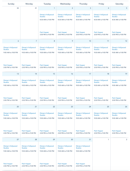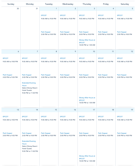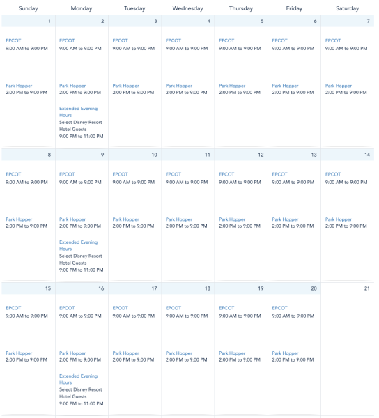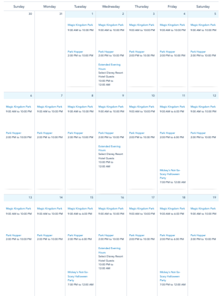 Note that Disney’s calendar only shows times through October 20th so far. The calendar will update each day with more times.