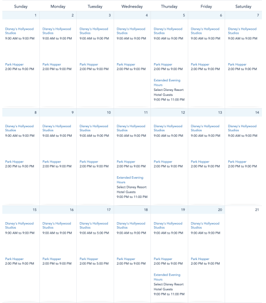Hollywood Studios will be open from 9AM to 9PM every day in September.
