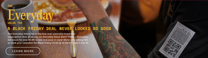 This Black Friday, Denny’s is offering FREE breakfast for a year if you buy one of their Everyday Value Tees for $5.99!