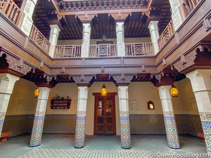 There’s more than meets the eye over in the Morocco Pavilion as well. Just when you think you can’t walk further into the pavilion, it keeps going — and eventually opens up into a few different areas that are often overlooked and feature tables and chairs. But, our favorite place to take a break in this pavilion is inside the Fez House.