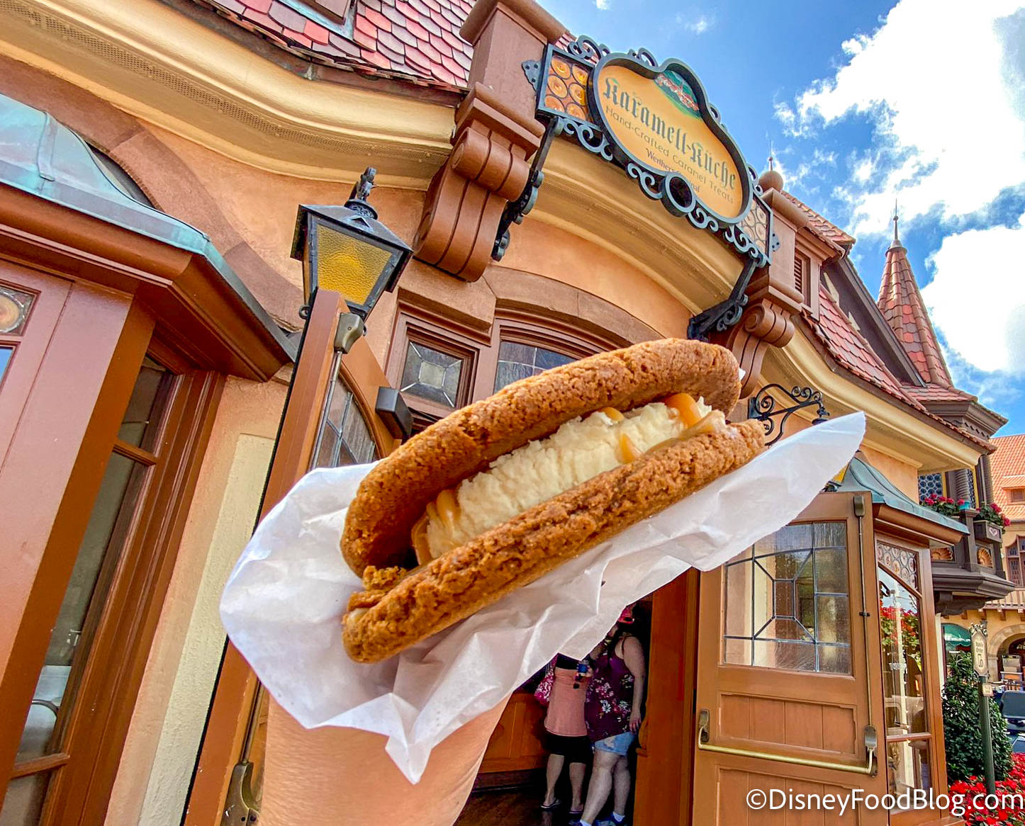 This absolutely DELICIOUS treat is from Karamell-Küche in EPCOT’s Germany pavilion, and it’s technically TWO cookies that you get to eat at once, so, you’re welcome. We made these at home and they turned out awesome, so we gotta share the recipe with you!