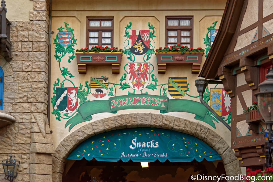Sommerfest is a German pavilion counter service that sells…(pause for dramatic effect)…PRETZELS AND BEER. They also sell bratwurst on a fresh-baked roll topped with sauerkraut, if you prefer that instead. If your Mickey pretzel just isn’t doing it for ya, then you’ll be happy to know this place sells JUMBO pretzels that might scratch that itch better. But if you’re wanting to sit down with that pretzel and beer to enjoy it for a spell, you might have to go looking elsewhere for seating. Seating at Sommerfest is very limited.