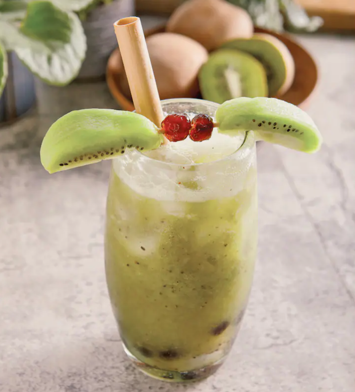 7. To garnish (optional), quarter the additional kiwi, cutting a small slit in the center or each quarter. Place two quarters on the rim of each glass for ears, and, using a short skewer, secure two pearls for eyes.