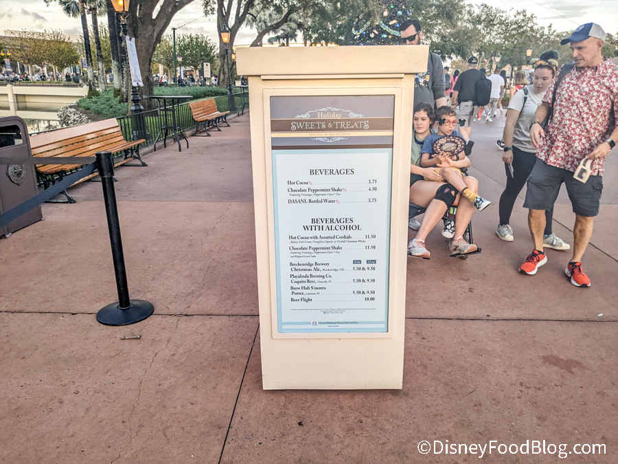 There are drinks with alcohol, and non-alcoholic options as well. The only real food you can get here is the completer treat for the Cookie Stroll. The Cookie Stroll is a sort of food challenge where, if you buy 5 cookies from designated food booths, you can get stamps for those purchases and then get a special treat at Holiday Sweets & Treats for FREE!