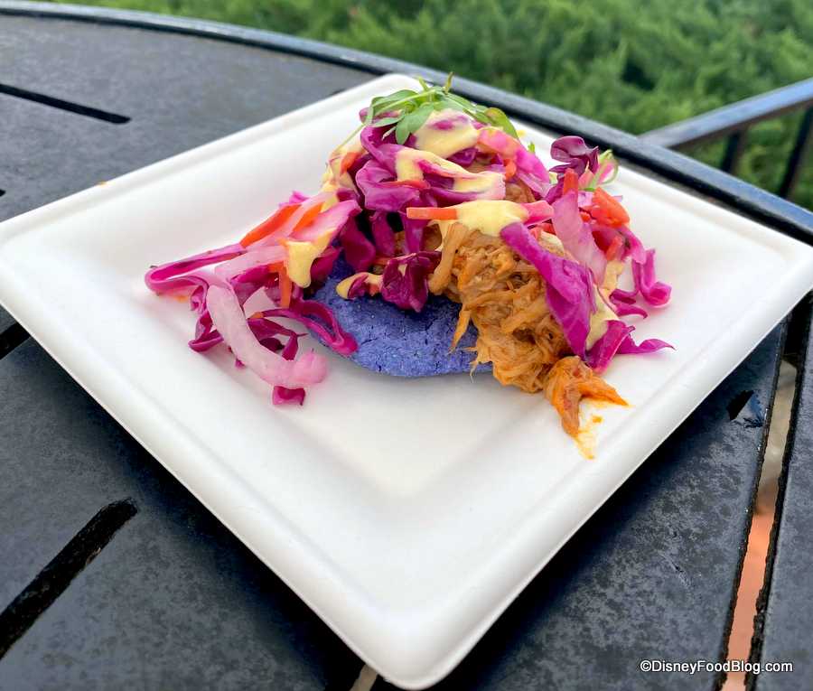 This Salvadoran dish comes from the Vibrante & Vívido at EPCOT’s Festival of the Arts. It’s a Blue Corn Pupusa stuffed with cheese and topped with shredded pork — yum!