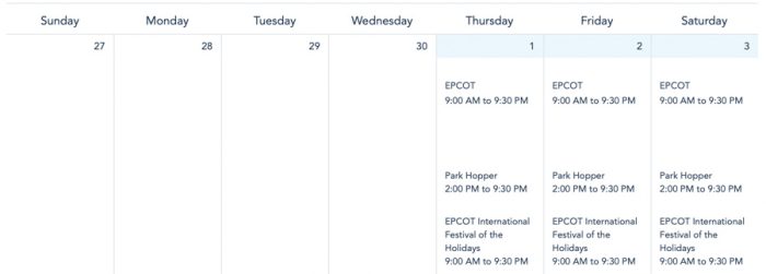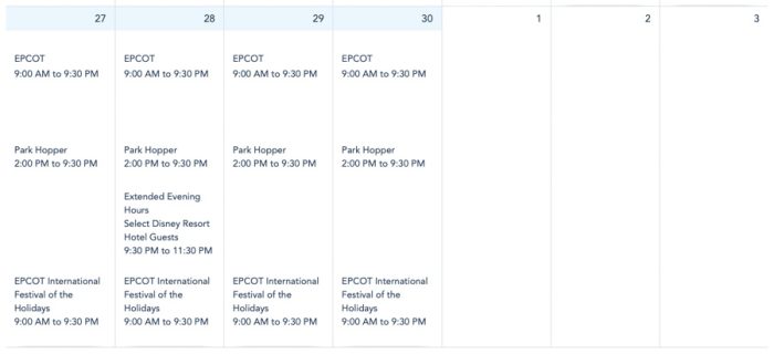 EPCOT will be open from 9AM to 9:30PM from November 27th to the 30th…