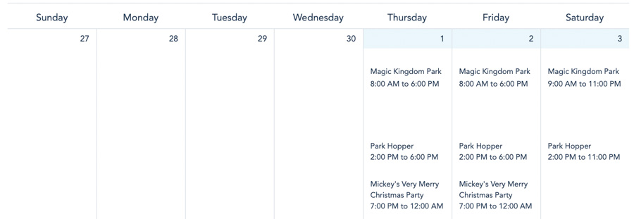 For December, Magic Kingdom will be open from 8AM to 6PM on December 1st & 2nd (with MVMCP happening from 7PM to 12AM), and from 9AM to 11PM on December 3rd.