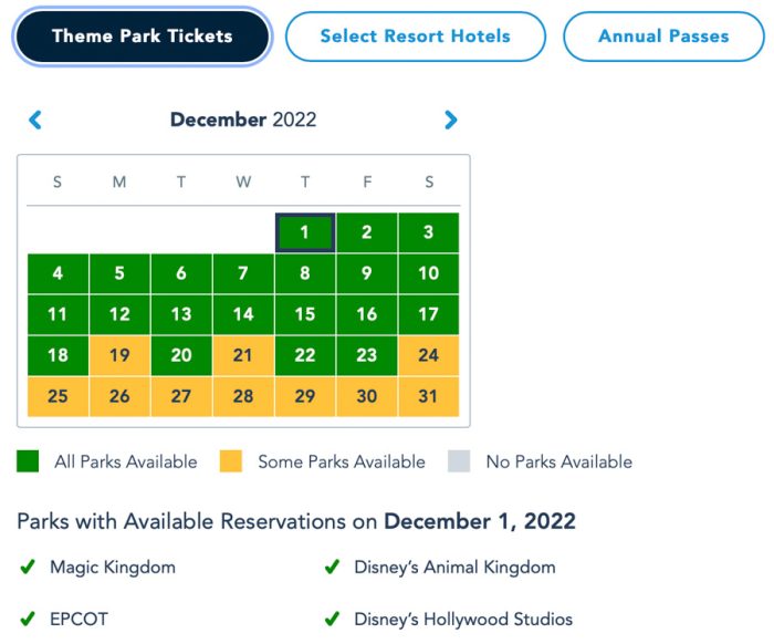 The Disney World Park Pass availability calendar is divided by theme park tickets, resort hotels, and Annual Passes. For visitors with Theme Park Tickets, there is full availability for the rest of November…