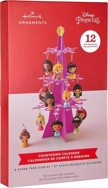 The Hallmark Disney Princess Countdown Calendar Miniature Christmas Tree Set comes with 12 miniature princess ornaments and its own paper Christmas tree!