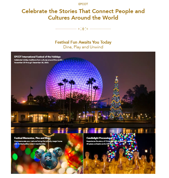 The first words that visitors to Disney World’s main EPCOT web page read are “Celebrate the Stories That Connect People and Cultures Around the World.” The second sentence? “Festival Fun Awaits You Today.”