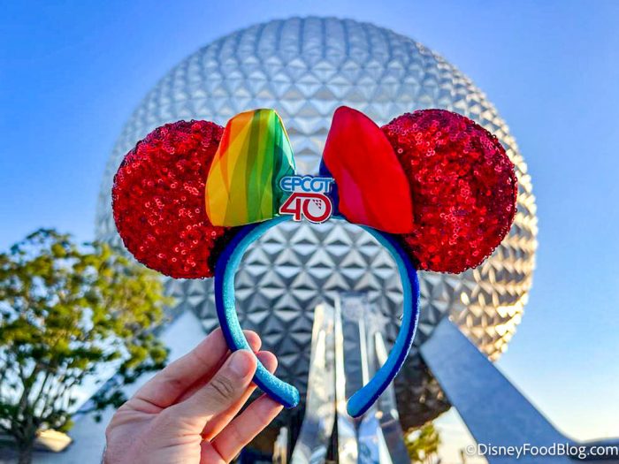 Starting at the Creations Shop in EPCOT’s World Celebration, we found the EPCOT 40th Anniversary Minnie Ears! The ears are covered in red sequins and have a rainbow bow in the middle with the EPCOT 40th logo.