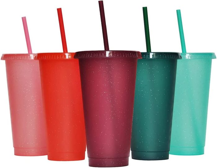 Finally, check out this set of 5 reusable plastic cups with straws and lids! They’re in different colors covered in glitter — perfect for the holidays!