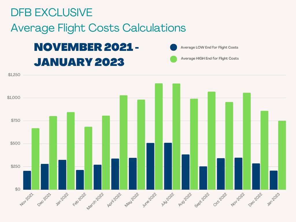 So, how has that changed from what we’ve seen in recent months? Well, the lower end cost is nearly $80 CHEAPER than the prices we saw for December 2022. It’s also cheaper than essentially every other month we’ve calculated averages for, except for November of 2021! That marks a pretty significant decrease in airfare prices (at least based on what we’ve seen).