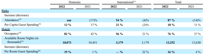 Occupancy nearly DOUBLED in Disney’s domestic hotels from 2021 to 2022, so that seems to have impacted things, along with more expensive room rates and other factors.
