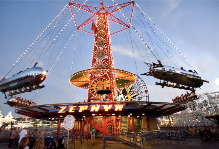 The Golden Zephyr was inspired by 1920s science fiction stories, with retro spaceship vehicles that rotate in a circle. It’s kind of like the Silly Symphony Swings, except, ya know, in rocket ships.