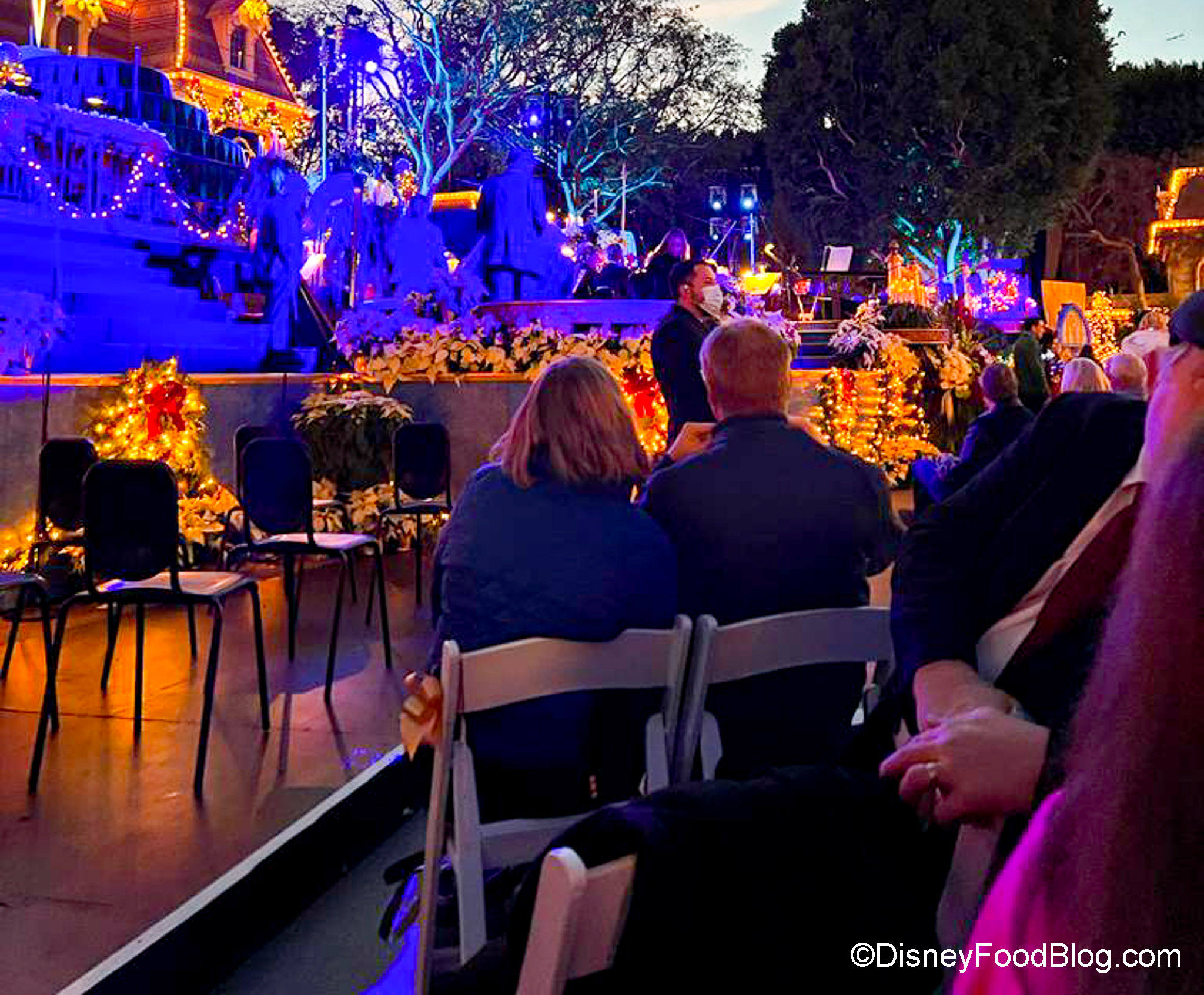 We got ready by taking our seats –– the Candlelight Processional takes place in front of the Main Street U.S.A. Railroad Station in Disneyland.