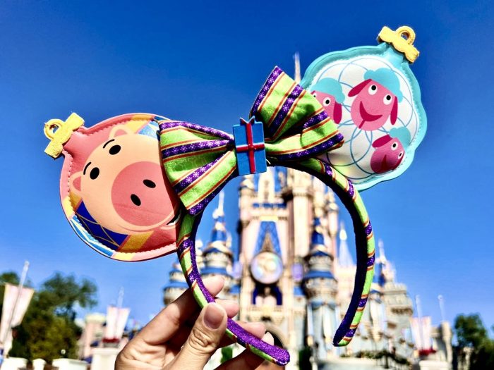 And YES. Yes, the ears are shaped like ornaments. YES, that is Hamm the Pig and Bo Peep’s Sheep. YES, that is a green, red, and purple bow. YES, that is a blue and red gift on top of the bow. The designer of these ears apparently didn’t say “no” to anything!