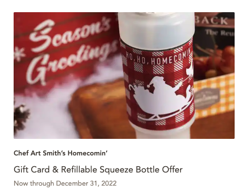 Over at Homecomin’ in Disney Springs, you can get a deal on gift cards right now. For every $100 gift card you buy, you can get a complimentary refillable squeeze bottle! This deal is going on until December 31st.