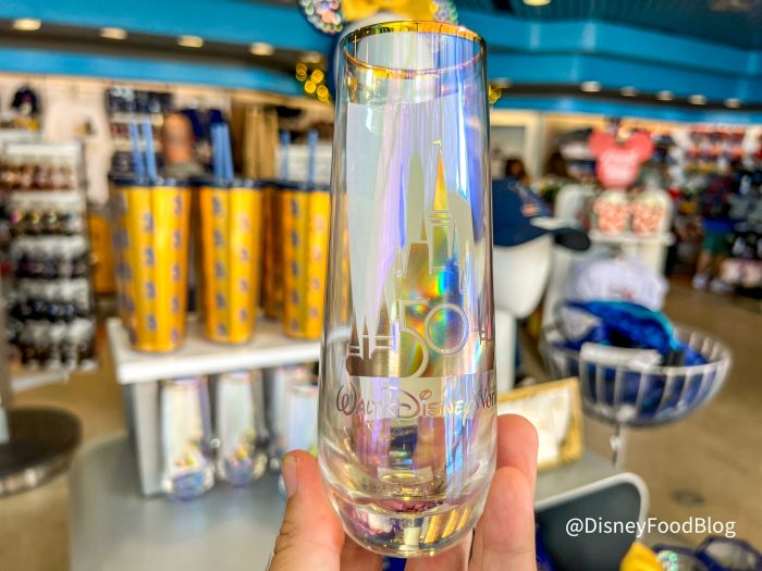 Over at Gateway Gifts near Spaceship Earth, we found the 50th Earidescent Champagne Flutes for $17.99.