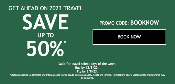 This discount applies to both domestic and international travel, and it applies to flights on Monday through Thursday as well as Saturday. A 25% discount applies to travel on Friday and Sunday. Use the code BOOKNOW when making your reservation.